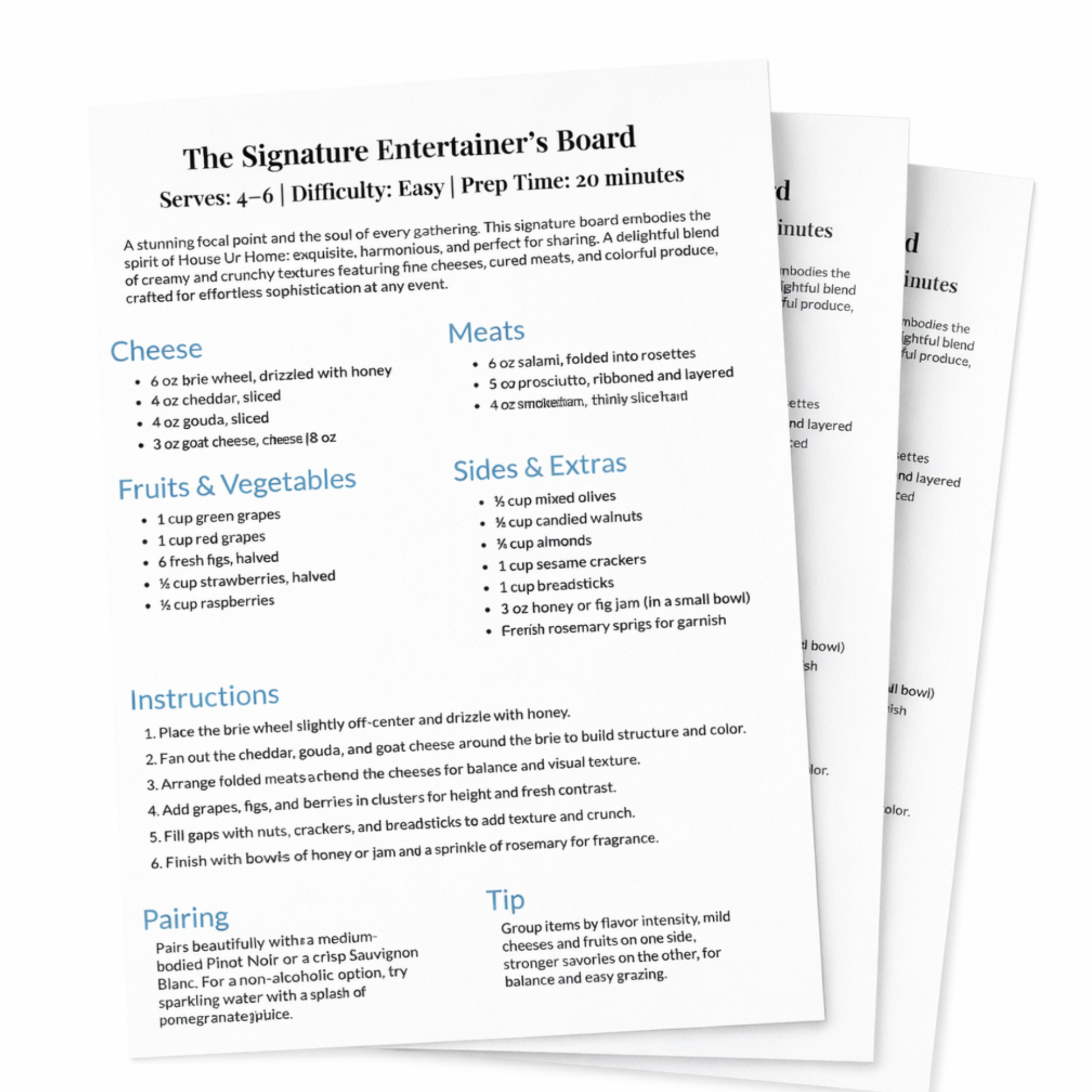 Bring beautiful charcuterie boards to life with confidence.This digital recipe book from House Ur Home shows you how to build stunning boards using balanced ingredients, thoughtful layouts, and simple hosting guidance.